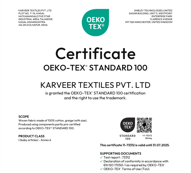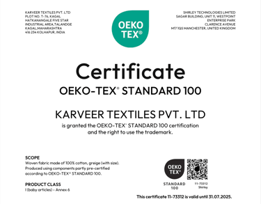 KARVEER TEXTILE PVT. LTD. is OEKO-TEX® STANDARD 100 certified, and manufactures OEKO-TEX Certified fabrics.